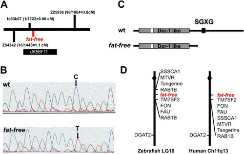 Positional cloning of the zebrafish ffr locus A) Schematic of the ffr locus. Marker fc83b07 is 0.06 cM from the ffr locus (1 recombinant out of 1732 meioses). A radiolabeled probe synthesized from fc83b07 identified five BAC clones. Mapping using the end sequences of these BAC clones indicated that clone dK56F11 spanned the entire ffr locus. B) A single nucleotide mutation (C to T) that results in a premature stop codon was identified in ffr mutants (0 recombinants > 2000 meioses) within a predicted open reading of dK56F11. C) Domain analysis indicates that Ffr has a Dor-1 like domain, a tyrosine phosphorylation site (Tyr-P), and a SGXG motif. The truncated mutant protein is predicted to be approximately half the length of wild-type Ffr. D) ffr is located on zebrafish chromosome 10 in a region syntenic to a region of human chromosome 11q13. |