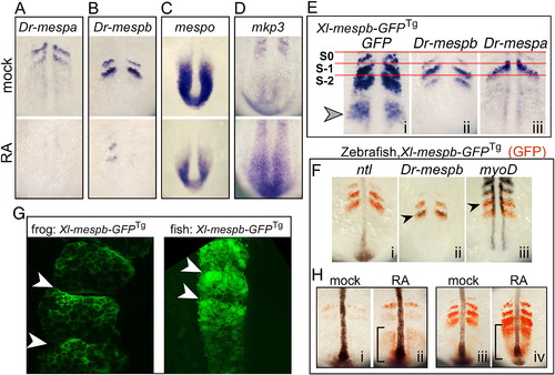 Zebrafish Mesp genes respond differently to RA treatment. (A–D) Zebrafish embryos treated with carrier control (DMSO; top panels) or with RA (lower panels) for 3 h and then stained for the expression of the indicated gene: A, Dr-mespa; B, Dr-mespb; C, mespo; D, mkp3. (E) Zebrafish embryos transgenic for Xl-mespb-GFP were stained for GFP RNA (i), Dr-mespb RNA (ii) or Dr-mespa RNA expression (iii) and aligned according to the first somite. (F) Double-label in situs on zebrafish embryos transgenic for Xl-mespb-GFP with GFP (red) and the gene indicated (purple) to localize the GFP expression pattern. (G) X. laevis (left panel) and zebrafish embryos (right panel) transgenic for the full-length Xl-mespb-GFP were imaged by confocal microscopy. Shown is a region containing newly formed somites, and where somitic boundaries are marked with arrowheads. (H) Zebrafish embryos transgenic for Xl-mespb-GFP were treated with RA at the 6 somite stage (i, ii) or 12 somite stage (iii, iv) and stained for GFP RNA (red) and for no tail (ntl) in purple to mark the notochord. Brackets mark the tailbud domain. Anterior is oriented up in all panels. |