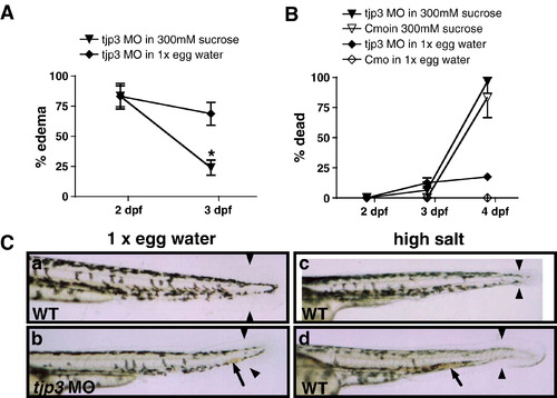 Compromised osmotic homeostasis mimics the tjp3/zo-3 morphant phenotype. (A) Pericardial edema of tjp3/zo-3 morphants can be reversed by growing the embryos in a hyperosmotic sucrose solution. At 2 dpf tjp3/zo-3 morphants were transferred into a 300 mM sucrose solution. ∼ 80% of tjp3/zo-3 morphants presented with edema (∼ 20% had a curved tail only). If grown in 1x egg water (diamonds), the incidence of edema only slightly decreased, due to individuals that died. However, if tjp3/zo-3 morphants were grown in 300 mM Sucrose (triangles), edema incidence dropped significantly. Mean and S.E.M.; n ≥ 10 per experiment; 5–6 independent experiments. 2-way ANOVA; p < 0.01. (B) Mortality of embryos grown in 300 mM sucrose. Morpholino injected embryos grown in 1x egg water had a mortality of only ∼ 20% at 4 dpf (diamonds), whereas the mortality for controls was very low (open diamonds). Placed in a hyperosmotic sucrose solution at 2 dpf, most morpholino injected (triangles) and control (open triangles) embryos survived up to 3 dpf, when edema incidence was counted. However, after 48 h exposure close to 90% of both control and morphant embryos died. There was no statistical significance between mortality of control or morphant embryos in 300 mM sucrose. Mean and S.E.M.; n ≥ 10 per experiment; 2–6 independent experiments. Two-way ANOVA; p > 0.5. (C) Exposure of WT embryos to high salt conditions mimics the tjp3/zo-3 morphant phenotype. WT embryos in 1x egg water have a straight tail, a wide tailfin and circulating blood (a). Tjp3/zo-3 morphants in 1x egg water presented with curved tail, reduced tailfin (b, arrowheads), the loss of blood circulation and an accumulation of red blood cells (b, arrow). 10–15% of control embryos raised in 100x egg water (c), 20x MgSO4 (d), 10x NaCl or 20x CaCl2 (data not shown), also presented with reduced tailfin (c, d, arrowheads), no blood circulation and accumulation of red blood cells (d, arrow). |
