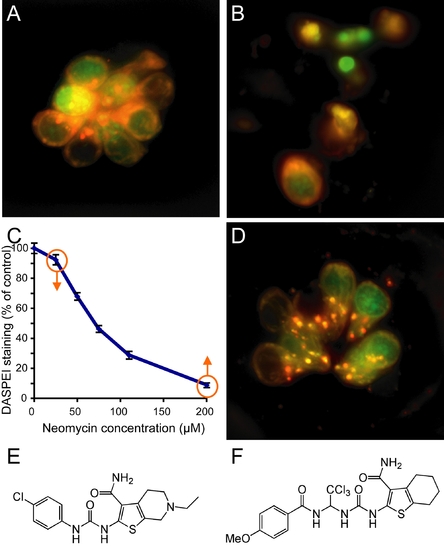 Screening for modifiers of aminoglycoside toxicity. (A) Neuromast from a control animal pretreated with 0.5% DMSO and stained with rapidly with FM 1-43FX (red) and the nuclear label Yo-Pro-1 (green). (B) Negative control pretreated with 0.05% DMSO for 1 hour followed by 200 μM neomycin treatment for 30 min. Hair cells are stained with FM 1-43FX (red) and Yo-Pro-1 (green). Hair cell loss, nuclear condensation and cytoplasmic shrinking are observed. (C) Dose-response function showing decreased hair cell labeling with DASPEI, a mitochondrial potentiometric dye, as a function of increasing neomycin concentration for wildtype zebrafish (N = 25–37 total fish per group, from triplicate experiments). Bars are SEM. Screens for increased or decreased susceptibility to hair cell loss were performed by treatment with either low, 25 μM, or high, 200 μM, neomycin doses, respectively, as highlighted by the orange arrows. (D) Neuromast pretreated with PROTO-2, a compound identified to provide protection against 200 µM neomycin exposure. (E,F) Show the structure for the identified compounds, PROTO-1 (E) and PROTO-2 (F), respectively.