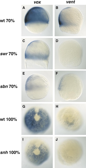 Expression of vox and vent in dorsalized zebrafish mutants. (A–F) Expression of vox and vent in 70% epiboly embryos, lateral view, dorsal is to the right. (A, B) Wild-type (wt) embryos. (C, D) swirl (swr) mutants. (E, F) somitabun (sbn) mutants. Note that the marginal expression of vox is retained in swr (C) and sbn (E) embryos. (G–J) Expression of vox and vent in 100% epiboly embryos, vegetal view, dorsal is to the top. (G, H) Wild-type embryos. (I, J) snailhouse (snh) embryos. Note that the expression level is reduced in snh embryos but the pattern of expression is unchanged. |