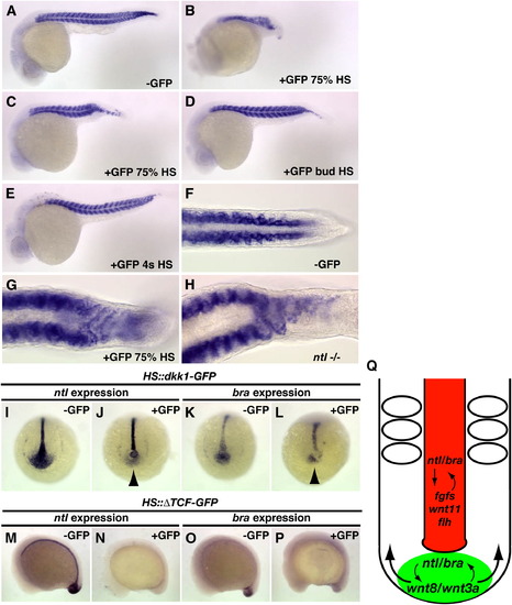 Ntl/Bra Functions in an Autoregulatory Loop with Canonical Wnt Signaling (A–H) Twenty-four hours postfertilization, embryos stained for myoD RNA expression from (A–G) the HS::dkk1-GFP line or (H) the ntl mutant. Temperature shifts (HS) were performed on hemizygous embryos at the indicated stage and then embryos were sorted based on GFP expression. (B, C, and G) GFP+ embryos shifted at 75% epiboly phenocopy ntl/bra loss-of-function embryos. (A–E) Lateral views; (F–H) dorsal views at the posterior end of the myoD-expressing region. (I–L) Posterior view of four-somite (4s) HS::dkk1-GFP outcross embryos temperature shifted at 75% have a loss of (J) ntl and (L) bra expression in the mesodermal precursors of GFP+ embryos (arrowheads). (M–P) Lateral view of HS::ΔTCF-GFP outcross embryos temperature shifted at the eight-somite stage and fixed 30 min afterward have a loss of (N) ntl and (P) bra expression in GFP+ embryos. (Q) A schematic of a somitogenesis-stage embryo shown from a dorsal view with anterior to the top, illustrating two different functions of ntl and bra during mesoderm development. In the notochord (red), ntl and bra are involved in a putative autoregulatory loop with fgfs and are upstream of wnt11 and flh, whereas in the paraxial mesodermal precursors (green), ntl and bra function in an autoregulatory loop with canonical Wnts to maintain precursors throughout somitogenesis. Canonical Wnts also regulate the presomitic mesoderm. |