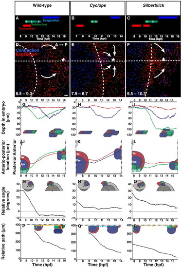 Quantitative comparison of forebrain morphogenesis in wild type, cyc morphant and slb. (A,D,G,J,M,P) Wild type. (B,E,H,K,N,Q) cyc morphant. (C,F,J,L,O,R) slb. Dotted line, midline; dashed line, neural-plate border. (A-C) Timing of principal morphogenetic phases. Keel subduction is subdivided into: 1, moving deep; 2, moving forwards and deep; and 3, moving forwards. (D-F) Neural-plate contraction shown by a measure of tissue deformation. Dorsal view, anterior to left, as indicated. The orientations of deformation vectors show the principal directions and their length proportional to magnitude. Neural and non-neural ectoderm is distinct. In wildtype and cyc morphant embryos, keel initiation (asterisk) is coincident with the focal point of neural-plate contraction (arrows), but in slb these two behaviours are dissociated. (G-I) Depth within the embryo of medial tissue during keel formation. Hypothalamus undergoes subduction in wild type (G) and slb (I); the medial eye field subducts in cyc morphant (H). Telencephalon remains shallow in all cases. (J-L) Locations of the subducting tissues relative to the telencephalon, shown by location along the anterior-posterior axis. (M-O) The same data is plotted as angular positions measured around the great circle along the midline, relative to an arbitrary anterior reference point. (P-R) Rate of eye evagination was measured from the movement of posterior eye-field cells that remain connected to the neural tube, after evagination, relative to their anterior counterparts. These are future optic-stalk cells in wild type (P) and slb (R), and the residual band of retina in cyc morphant (Q). Positions were followed along the path of movement rather than the straight-line distance. Reduced anterior-posterior reorganisation in slb is evident. hpf, hours post fertilisation. (D,F) Time (bottom left-hand corner) in hpf. Colours for A-C,G-R are indicated in A; and for D-F in D. A, anterior; P, posterior. Scale bars: 25 μm.
