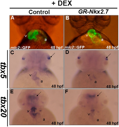 The expressions of tbx5 and tbx20 were modulated by Nkx2.7. Each embryo derived from transgenic line Tg(cmlc2::GFP), whose heart was specifically tagged with green fluorescent protein, was injected with 0.15 ng of plasmid, in which Nkx2.7 mRNA was transcribed conditionally by adding dexamethasone. All embryos were treated with dexamethasone at 10 hpf and took a ventral view at 48 hpf to observe the cardiac development under the fluorescence microscope. The cardiac morphologies of the control embryos and the GR-Nkx2.7-overexpression embryos were shown. Compared to the control (A), various cardiac defects were found in around 35% of embryos from the GR-Nkx2.7-overexpression group, including unlooping and shrunken heart (B). In addition, the expressions of tbx5 (C, D) and tbx20 (E, F) were down-regulated in the GR-Nkx2.7-overexpresion embryos. However, the expression levels of tbx5 in eyes (indicated by arrows in C and D) and tbx20 in brain (indicated by arrows in E and F) remained unchanged. v: ventricle; a: atrium. |