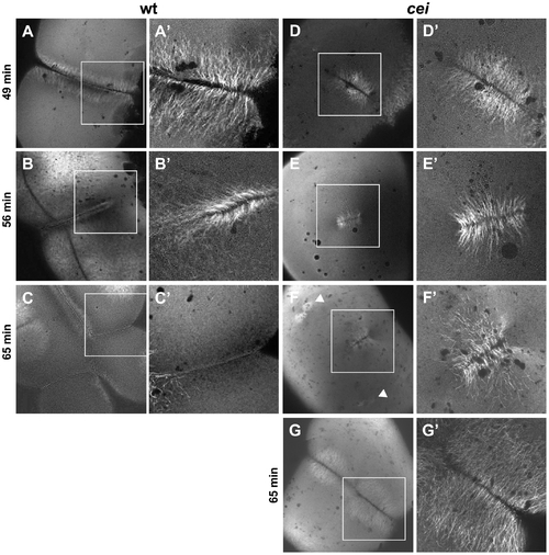 Defective cytoskeletal dynamics in cei/aurB mutant embryos. (A–G) High magnification images of wild-type (A–C) and cei mutant (D–G) embryos fixed at the indicated time points and labeled with an anti-α-tubulin antibody. Images show the FMA structure, which after formation of the furrow (A) becomes enriched in the distal region of the wild-type embryo (B) and eventually disassembles (C). In maternal cei mutants, the truncated FMA forms in the center of the blastodisc (D) and neither translocates distally nor becomes disassembled (E,F). Arrowheads in (F) indicate FMA remnants corresponding to the second cleavage planes. A rare maternal cei mutant embryo with a weaker phenotype (G) showing that defects in FMA reorganization and disassembly can be observed even when the furrow encompasses the entirety of the blastodisc. |