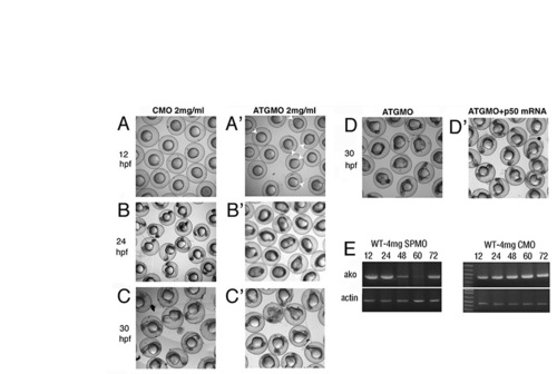 ako is supplied maternally. (A,A′) Control morpholino injection has no effect on development (A), whereas anti-ATG morpholino against the dynactin 2 gene results in a delayed epiboly (A′). In many embryos, yolk plug closure is not completed even at 12 hpf (white arrowheads in A′). (B,B′) By 24 hpf, the yolk is abnormally elongated, the tail region is severely stunted, and cell death appears to be abundant along the entire body axis of dynactin 2 morphants (B′, compare to control morpholino-treated embryos in B). (C,C′) Similarly, embryonic development shows severe defects in morphants at 30 hpf (C′, compare with C). (D,D′) These defects are rescued by ako mRNA injections at 30 hpf (D′, compare with D). (E) RT-PCR amplification of the ako transcript from control (CMO) and splice-site (SPMO) morpholino-treated embryos. Actin amplification is used as a control. In SP morpholino-treated embryos, ako mRNA can be efficiently amplified at 12 and 24 hpf, but not at 48 and 60 hpf, indicating the presence of maternally contributed transcript at early stages of embryogenesis. The transcript is detected again at 72 hpf, presumably because of a decrease of knockdown efficiency.