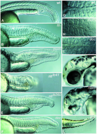 Images of live mutant embryos. Anterior is left, dorsal is top in all pictures, except in G-I, which are dorsal views. (A) 24-hour old wild-type embryo. (B) flhtk241 embryo; a small patch of floor plate in the ventral neural tube is indicated by an arrowhead. (C) momth211 embryo. (D) ntl embryo with the strongest allele, ntltc41. (E) ntlts260, the weak allele produces a reduced ventral tailfin. (F) doctt258 embryo. (G-I) Dorsal view of 10-somite stage embryos: (G) wild type, (H) momth211 and (I) doctt258. (J-K) Heads of 48-hour (J) wild-type and (K) mom larvae in a lateral view. (L) Tailtip of a 60 hour doctt258 larva. |
