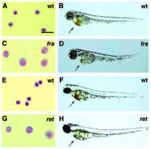 Mutations in the genes frascati (frs) and retsina (ret) cause a reduction in the number of circulating blood cells. The remaining blood cells also have an abnormal cell morphology. (A,C,E,G) Isolated blood cells from wild-type and mutant larvae stained by the Wright- Giemsa method. (B,D,F,H) O-dianisidine staining for hemoglobin (arrows) in wild-type and mutant embryos. (A) Blood cells from 2-day old wild-type embryos have the normal morphology of erythroblasts. (B) Hemoglobin in red blood cells is strongly stained in wild-type embryos. (C) The circulating cells of 2-day old frstq223 mutant embryos are larger than normal erythroid cells and many have abnormally fragmented nuclei. (D) The number of blood cells in 2-day old frstq223 mutant embryos is greatly reduced which is reflected in the lower amount of hemoglobin. (E) Blood cells of 3-day old wild-type larva are small erythroblasts. (F) The 3-day old wild-type larva also has a large number of red blood cells producing hemoglobin. (G) The circulating cells of a 3-day old rettr217 mutant larva are larger and more basophilic than normal. (H) The 3-day old rettr217 mutant larva expresses very little hemoglobin, based on o-dianisidine staining. Scale bar (A,C,E,G) is equal to 20 µm. |
