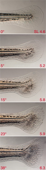 Notochord flexion in a single individual. In each panel, degrees of flexion are shown at the lower left and corresponding standard length (SL) at the lower right. As the notochord bends, the rate of SL increase drops briefly (e.g., 15-23°). |