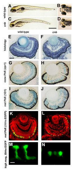 The cnb mutation disrupts photoreceptor development. (A-D) Side (A, C) and dorsal (B, D) views of 5-dpf wild-type (A, B) and cnb mutant (C, D) embryos. (E-F) Retinal histology of wild-type (E) and cnb (F) retina at 4 dpf. (G, H) Zpr-1 immunoreactivity (brown) to label double cone photoreceptors (PhR) in 4-dpf wild-type (G) and cnb embryos (H). (I, J) ID1 immunoreactivity (brown) to label rod photoreceptors in 4-dpf wild-type (G) and cnb embryos (H). Nuclei in (G, H) are counterstained with methylene blue. (K-N) Confocal microscopy of wild-type (K, M) and cnb (L, N) whole retina (K, L) and individual rod photoreceptor cells (M, N) from Tg(Xlrho:EGFP)fl1 fish. Green, Xlrho:EGFP-positive cells; red, propidium iodide positive nuclei. Scale bars: 1 mm in (A, C); 40 μm in (E-L); 5 μm in (M, N). EGFP, enhanced green fluorescent protein.