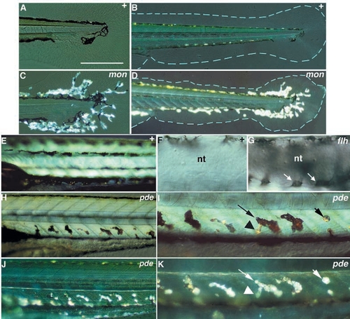 Phenotypes of ectopic chromatophore mutations (Class V). Wild-type siblings are compared with homozygous mutants for mon (A-D), pde (E,H-K) and flh (F,G). mon larvae display on the sixth day large numbers of iridophores extending into the medial fins (C,D), while medial fins (blue outline) are irregular in shape and reduced in area (D). During the pharyngula period, melanophores are normally found in close association with the neural tube in a dorsal position (F), but in flh mutant embryos they completely encircle the neural tube (melanophores on the ventral surface of the tube; arrow, G). On the sixth day, pde larvae show dorsoventrally oriented chromatophores ventral to the notochord and dorsal to the ventral stripe (H, and at higher magnification, in I), which are not present in the wild type (E). Most of these chromatophores look like melanophores under transmitted light, but have large regions (see arrowhead, I) with the appearance of iridophores. When viewed with incident light (J,K), most of these chromatophores (e.g. long arrow, K) look like iridophores. The morphology of these regions strongly implies that the same cell contains both melanosomes and iridosomes. Some of these chromatophores (short arrow, I and K) appear to be pure iridophores. B-D and I-K were photographed with incident light. nt, neural tube. Scale bars, 200 μm (A,C), 400 μm (B,D), 225 μm (E,H,J), 70 μm (F,G) and 110 μm (I,K).