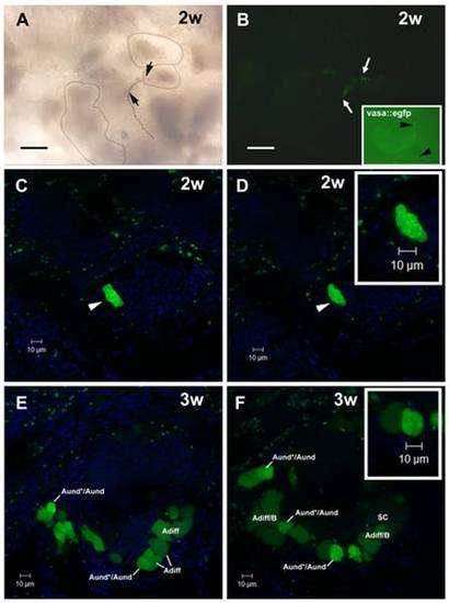 SSC transplantation into male zebrafish recipients. A,B. Recipient testes after two weeks (2w) of transplantation analyzed by light (A) and fluorescence (B) microscopies. Seminiferous tubules are delimited by stippled lines. Arrows indicate the same area in A and B. Donor cells formed clusters situated near the interstitium in a similar way as observed in vasa::egfp testes (see arrowheads in the inset). Nuclei (blue) are stained with DAPI. Scale bars = 50 μm. C,D. CLSM analysis of recipient testes after two weeks (2w) of transplantation. Arrowheads indicate a donor-derived cyst composed of ~8 cells. Inset. High magnification of donor-derived cyst. Nuclei (blue) are stained with DAPI. E,F. Recipient testes after 3 weeks (3w) of transplantation analyzed under CLSM. Donor-derived cysts increased their number and size, being found at different stages of spermatogenesis. Type A undifferentiated spermatogonia (Aund*/Aund), type A differentiating spermatogonia (Adiff), type B spermatogonia (B), and spermatocytes (SC). Inset shows a high magnification of type A undifferentiated spermatogonia. Nuclei (blue) are stained with DAPI. |