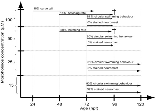 Concentration-dependent endpoints. The morpholino against ERβ2 (ERβ2 MO) was used at concentrations ranging from 15 µM to 100 µM, as plotted on the Y axes. The X axes represent the age of observed larvae in hours post fertilization (hpf). The black arrows point to the time where the specific phenotype was observed. Four biological endpoints were observed: a curved tail at 100 µM, a lower hatching rate at 100 and 50 µM, a disturbed swimming behavior at all concentrations and a disruption in the neuromast development at all concentrations. |