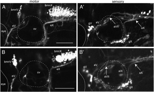 Hh signaling does not have a direct role on central sensory axon pathfinding. Images are from 4 dpf larvae co-expressing isl:gfp (left panels) and 3.2.cherry (right panels). The images shown are representative of 4 control and 7 treated embryos imaged from 2 separate experiments. Panels A, A′ is a control larva (0.5% ethanol); B,B′ cycA treatment (50 μM cycA/0.5% ethanol) beginning at 24 hpf shows no effect on either sets of axons. Dotted circle is otic vesicle (ov), eyes are demarcated by thin solid line. Arrows in A′ and B′ point to vagal afferents entering hindbrain. bmnV, motor nucleus of V; bmnX, vagal motor nucleus; eV, efferent nerve of bmnV; eX, efferent nerve of bmnX; aV, afferent nerve of gV; gV, trigeminal sensory ganglion; gX, vagal sensory ganglion; aVII, afferent nerve of gVII; aIX, afferent nerve of gIX; aX, afferent nerve of gX. Anterior to left, dorsal at top. Scale bars are 100 μm. |