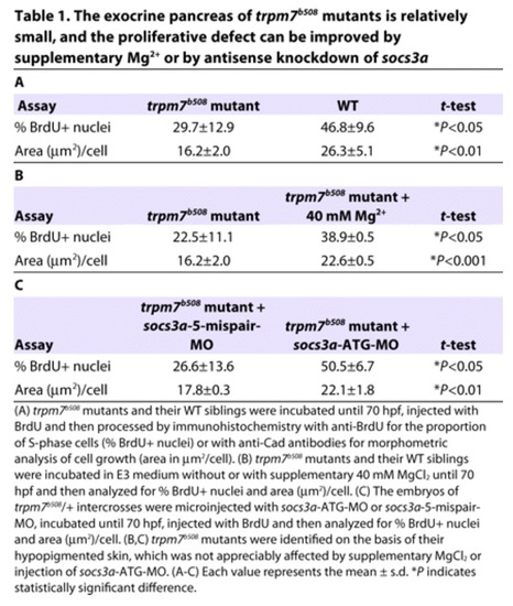 The exocrine pancreas of trpm7b508 mutants is relatively small, and the proliferative defect can be improved by supplementary Mg2+ or by antisense knockdown of socs3a. |