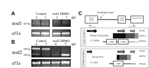 Confirmation of Nod knockdown in zebrafish larvae. RT-PCR detection of (A) nod1 and (B) nod2 transcripts following MO-mediated depletion from 2 and 3 dpf (A) and 6 and 7 dpf (B) larvae. Ef1a was used as a control. (C) In silico analysis of predicted proteins derived from zebrafish Nod2 splice variants. The genomic structure with morpholino target and primer binding sites is shown at top. Exons amplified by RT-PCR are depicted as individual arrows and as a continuous amplicon of mRNA. Predicted protein structure is illustrated with shading indicating the contribution of each exon to the predicted domains. |