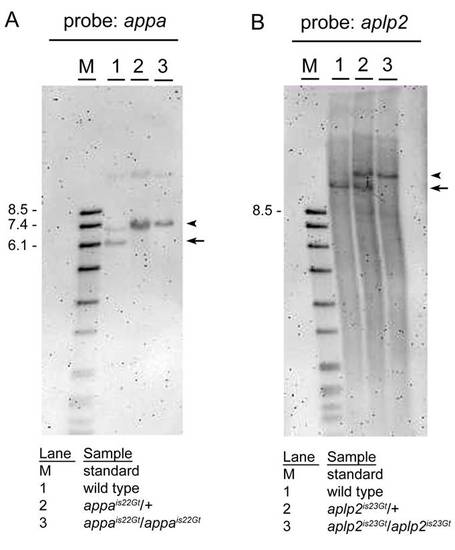 Gene trap lines appais22Gt and aplp2is23Gt contain Tol2 transposon integrations. A: SphI digested genomic DNA from wild-type (1), heterozygous appais22Gt/+ (2), and homozygous appais22Gt/is22Gt (3) adults, blotted and hybridized with an appa specific probe. The wild-type restriction fragment of <6.2 kb (arrow) is shifted to <7.2 kb (arrowhead) as expected due to the Tol2 integration in transgenic appais22Gt embryos. The faint higher band in lane 1 might be due to incomplete digestion or polymorphism in the appa gene in the WIK wild-type strain. The sample run in lane 2 is most likely DNA from a homozygous instead of heterozygous adult. B: SacI digested genomic DNA from wild-type (1), heterozygous aplp2is23Gt/+ (2), and homozygous aplp2is23Gt/is23Gt (3) adults, blotted and hybridized with an aplp2 specific probe. The wild-type restriction fragment of <12.1 kb in the aplp2 gene (arrow) is shifted to the expected size of <15.1 kb (arrowhead), due to the <3 kb Tol2 transposon integration, in the heterozygous aplp2is23Gt/+ adult. The homozygous aplp2is23Gt/is23Gt adult has one band at the expected size of <15.1 kb. |