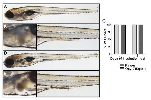 6 days of oxytetracycline exposure does not produce mortality nor adverse effects on larvae. Larvae were incubated during 120 hrs and 144 hrs to ensure that the treatment with oxytetracycline does not produce any detrimental effects on larvae. We did not found phenotypic effects such cerebral edema, bending of the tail (A, D), pericardial edema, abnormal heart function (B, E), or any somite malformation (C, F). No change in survival rate was detected at the time analyzed (G). |