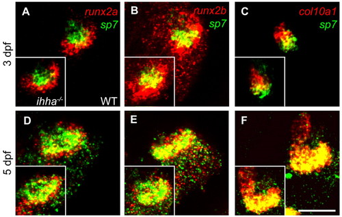 Osteoblast stage markers are unaffected in ihha mutants. Confocal projections showing expression of osteoblast markers at 3 and 5 dpf by whole-mount fluorescent in situ hybridization. Wild-type expression is shown in the main panels and ihha mutant expression is shown in the insets. Images are lateral views with dorsal upwards and anterior towards the left. (A,B) At 3 dpf, runx2a/b expression surrounds and overlaps ventral sp7 expression in the Op, and is unchanged in ihha mutants. (C) col10a1 is expressed in the dorsal Op at 3 dpf and is unchanged in ihha mutants. (D,E) At 5 dpf, runx2a/b expression colocalizes with sp7 along the vp edge and is also apparent ventral to the vp edge in non-sp7-expressing cells. Expression is similar in ihha mutants. (F) At 5 dpf, col10a1 is expressed at high levels throughout the Op. The domains of these markers appear slightly reduced at 5 dpf, matching the reduction in Op size. Scale bar: 50 μm.