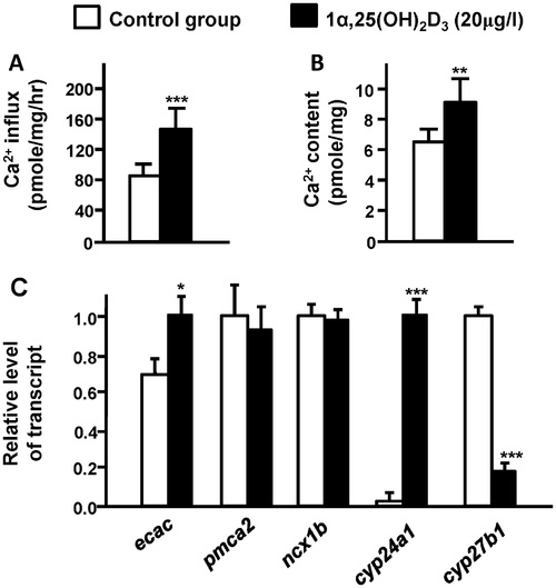 Effects of exogenous 1α,25(OH)2D3 (20 µg/l) in 3-d post-fertilization (dpf) zebrafish embryos. Ca2+ influx (A), Ca2+ content (B), mRNA expressions in 3-dpf zebrafish embryos (C). mRNA expressions were analyzed by a qPCR, and values were normalized to β-actin. Values are the mean ± SD (n = 7~10). Student’s t-test, *p<0.05; **p<0.01, ***p<0.001. |