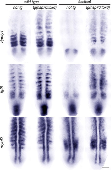 A pulse of Tbx6 expression in fss/tbx6 mutants induces segmental expression of ripply1 and fgf8, and locally represses myoD. Expression of genes expressed specifically in the anterior (ripply1, fgf8) and posterior (myoD) somite compartments in non-tg and tg(hsp70:tbx6) wild type sibling and fss/tbx6 mutant embryos. Embryos were heat shocked at the 9–10S stage, fixed at the 13–14S (myoD) and 15–16S stage (ripply1, fgf8), and flat-mounted for documentation. Scale bar: 50 μm. |