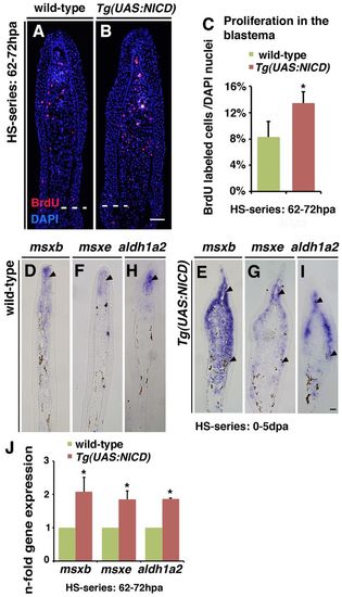 Notch gain of function increases proliferation and is accompanied by an expansion of distal blastema marker expression into proximal regions. (A-C) BrdU-stained fin sections after a 10-hour heat-shock series (62-72 hpa) and quantification of the percentage of BrdU-labelled DAPI nuclei in the blastema: more cells incorporate BrdU in Tg(UAS:NICD) fins (B) than in wild-type fins (A). Asterisk in B indicates autofluorescent blood vessels. *P<0.05. (D-I) msxb, msxe and aldh1a2 in situ hybridization (5 dpa). Arrowheads indicate expression of msxb, msxe and aldh1a2. (J) qPCR analysis after a 10-hour heat-shock series (62-72 hpa): msxb, msxe and aldh1a2 transcripts are increased in Tg(UAS:NICD) fins. *P<0.05. Scale bars: 10 μm in B,I.