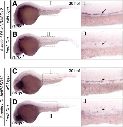The definitive hematopoiesis is disrupted in the hNRASD12-expressing embryos. (A-D) WISH analysis of runx1+ and cmyb+ definitive hematopoietic stem cells (HSCs) in the aorta-gonad-mesonephros (AGM) region of the trunk in the control (A, C) and hNRASD12 embryos (B, D) at 30 hpf (arrows). |