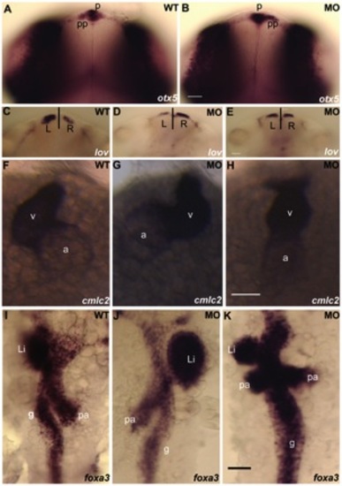 Loss-of-function of dyx1c1 caused L–R assymetry defects in zebrafish. Whole-mount in situ hybridization showing the expression of laterality markers in WT and dyx1c1 morphants (ATGMO+SPMO) at 2 dpf. The position of the asymmetrically placed organs was irregular in at least 50% of the embryos injected with dyx1c1 MO. otx5 expression showing the left sided placement of the parapineal organ in WT (A). In dyx1c1 morphant, the parapineal position was reversed (B). lov was strongly expressed in the left habenular in WT (C). In dyx1c1 morphant lov expression was stronger in the right or expressed symmetrically (D & E). Knockdown of dyx1c1 altered heart looping. Ventral views of embryos at 2 dpf (F–H). cmlc2 expression showed normal heart looping in WT (F). Cardiac looping was reversed (G) or absent in dyx1c1 morphant embryos (H). Expression of foxa3 revealing the position of the gut, liver and pancreas in WT embryo (I). The positions of the liver, gut and pancreas were irregular in dyx1c1 morphants (J & K). Panels A, B, C, D, E, I, J and K are dorsal views with anterior to the top. Frontal views are shown in panels F–G. Scale bars indicate 50 μm. Abbreviations: p, pineal organ: pp, parapineal organ: v, ventricle: a, atrium: li, liver: pa, pancreas: g, gut.