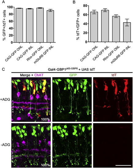 Additional Analysis of Electroporated Retinas from Figure S4, Related to Figure 4 Refer to Figure 4 and Methods for experimental setup. (A) Tight-coupling of tdT+ cells with GFP expression. Among cells that expressed tdT, the percentage of cells expressing GFP is shown. (B) Efficiency of tdT activation in GFP-expressing cells. Percentage of tdT+ cells among GFP+ cells. Note the tdT+/GFP+ data points for Rho-GFP and mGluR6-GFP were also presented in Figure S4 for a different argument. Plots show mean ± SD. See Table S3 for summary. (C) mGluR6-GFP bipolar cells project to the correct IPL sublaminae in the presence of Gal4-GBP1p65-GBP6. CD1 mouse retinas were electroporated at P0 with plasmids encoding mGluR6-GFP (green), Gal4-GBP1p65-GBP6, UAS-tdT (red) and CAG-nlacZ. Retinas stained for anti-GFP (green) and anti-ChAT (magenta). The IPL is divided into 5 sublaminae (white font in merge panels), with the ON bipolar cells stratifying below the midline dividing sublaminae 2 and 3. Anti-ChAT labels the boundary between sublaminae 1 and 2, and also the boundary between 3 and 4. % GFP+ and GFP+/tdT+ cells stratifying below the midline of 2 and 3 are shown in merge panels. n = 28 for +ADG condition and n = 31 for –ADG condition. Cells were sampled across two retinas per condition. Scale bar, 20 μm. |