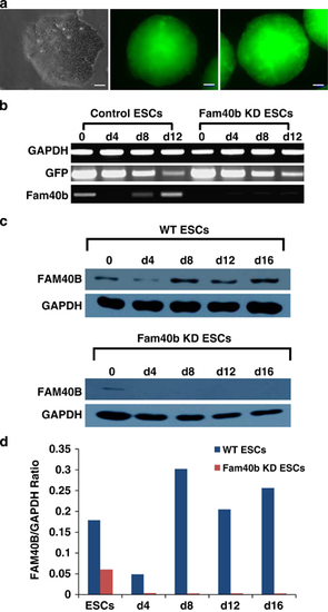 Generation and characterization of ESCs in which Fam40b was constitutively knocked down (KD) by transfection with pGFP-V-RS, expressing shRNA directed against the Fam40b RNA, the GFP and the puromycin resistance cassette. (a) Fluorescence microscopy of control 12-day EBs derived from ESCs transfected with the pGFP-V-RS vector without shRNA (control) and EBs derived from ESCs transfected with the pGFP-V-RS shRNA expressing vector containing 29-mers shRNA (Fam40b KD EBs) (scale bar: 50μm). (b) Semiquantitative RT-PCR analysis of the expression of GFP and Fam40b in undifferentiated control and KD Fam40bESCs as well as in 4-, 8- and 12-day control and KD EBs generated by the hanging drop protocol. (c) Expression of the FAM40B protein during differentiation of WT ESCs (upper panel) and during differentiation of Fam40B KD ESCs. Detection has been performed with FAM40b primary antibody (sc-162799, Santa Cruz Biotechnology; 1:500 dilution) and with the secondary donkey anti-Goat IgG antibody (1:10000 dilution). GAPDH has been detected using the anti-GAPDH antibody (1:25000 dilution). (d) Densitometric analysis of the FAM40B and the corresponding GAPDH bands densities has been performed by using the ImageJ 1.47v software (National Institutes of Health, Bethesda, MD, USA) and the ratio of the FAM40B/GAPDH band densities has been blotted for the different time points of differentiation |