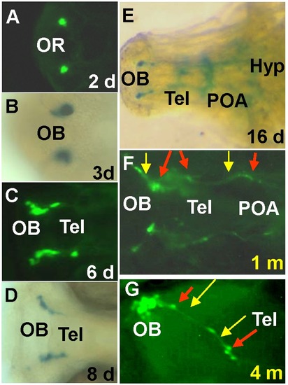 Detection of GFP- and LacZ-expressing cells in transgenic fish. A, GFP expression at the olfactory region (OR). B–D, GFP or LacZ cells in the olfactory bulb (OB) and telencephalon (Tel) at 3–8 d (days). E, lacZ cells and axons in the brain at 16 dpf. Hyp, hypothalamus. F–G, At 1 month (m) and 4 months, fluorescent axonal extensions are at OB, Tel and POA (preoptic area). Red arrows indicate cell bodies, yellow arrows indicate axons. A, C, F, G, GFP cells; B, D, E, LacZ-expressing cells. The anterior is towards the left in all panels. A, B, F, G, ventral view; C-E, dorsal view. |