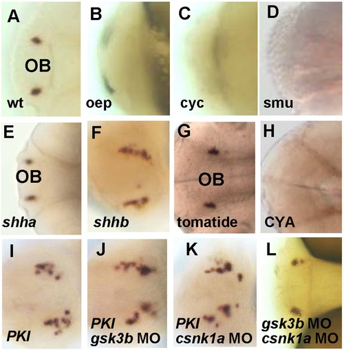 Hh-PKA pathway is required for the development of gnrh3 neurons. All embryos are at 2A–D, gnrh3 neurons were detected by in situ hybridization with the gnrh3 probe in the wildtype (wt), but not in oep, cyc and smu mutants. E–F. Ectopic GFP expression near the olfactory region in embryos injected with (F) shhb, but not (E) shha mRNA. G–H, gnrh3 signals were normal in control (G) tomatide-treated embryos, but were lost in embryos treated with (H) Hh inhibitor cyclopamine (CYA, 100 μM) at 6–10 hpf. I–K, More ectopic gnrh3-expressing cells were detected after co-injection of gsk3b-MO or cnsk1a-MO with PKI mRNA. L, Gsk3b and csnk1a double MO treatment did not increase the number of ectopic gnrh3-expressing cells. The anterior is to the left in all panels. |