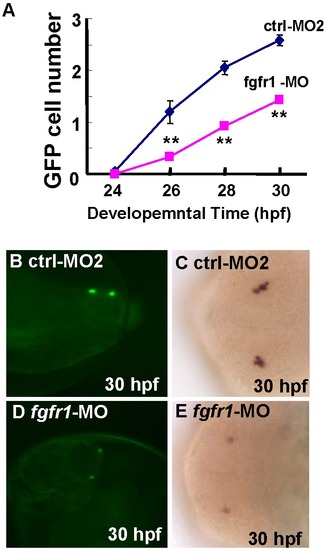 Requirement of Fgf pathway in the development of gnrh3 neurons. A, Decreased GFP cell numbers after injection of fgfr1-MO as compared with embryos injected with control MO2 (ctrl-MO2). B–E, Decreased gnrh3-expressing cells as detected by (B, D) GFP- or (C, E) in situ hybridization. The anterior is to the left in all panels. Twenty embryos were counted for each data point. **P<0.01. |