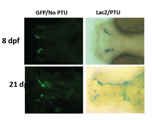 Similar patterns between LacZ staining and GFP signals at different stages. Lac Z staining are shown in zebrafish with PTU treatment. The GFP signals are expressed in zebrafish without PTU treatment. LacZ staining and GFP signals were observed at 8 dpf (upper two panels) and 21 dpf (lower two panels). |