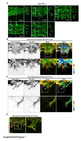 Visualization of F-actin in Endothelial Cells (ECs) during Caudal Vein Plexus (CVP) Formation. Related to Figure 1. A) Confocal z-stack images of the caudal regions of Tg(fli1:GFP) embryos at the developmental stages indicated at the right bottom corner of the images. The cross-sectional images of the areas indicated by dotted lines are shown in the panels to the right of the original images. CA, caudal artery; CV, caudal vein; CVP, caudal vein plexus. (B) 3D-rendered confocal microscopic images of the CVP of Tg(fli1:lifeact-mCherry);(fli1:Myr-GFP) embryo at 31 hpf. mCherry (Lifeact-mCherry) and GFP (Myr-GFP) images, their merged images (GFP, green; mCherry, red) and the mCherry/GFP ratio images shown in the intensity-modulated display (IMD) mode (Ratio) are shown as indicated at the top. The upper and lower limits of the ratio range are indicated on the right. The boxed areas are enlarged on the panels beneath the original images. (C) Confocal 3D images of the CVP of Tg(fli1:Myr-mCherry);(fli1:Myr-GFP) embryo at 31 hpf. mCherry (Myr-mCherry) and GFP (Myr-GFP) images, their merged images (GFP, green; mCherry, red) and the mCherry/GFP ratio images shown in the IMD mode (Ratio) are shown similar to B. (D) Confocal z-stack images of the CVP of Tg(fli1:Myr-mCherry);(fli1:Myr-GFP) embryo at 29 hpf. The merged images of mCherry (Lifeact-mCherry) and GFP (Myr-GFP) are shown. The boxed area is enlarged in the right panel. Scale bars: 50 µm (A) and 20 µm (D). |