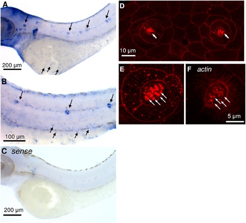 In situ hybridization and immunocytochemistry of anion exchanger 1b (AE1b) in zebrafish larvae. AE1b mRNA was expressed by ionocytes (short arrows) and neuromasts (long arrows) of 72-h post-fertilization (hpf) larvae (A, B). No signal was found in larval skin with the sense probe (C). Confocal images of lateral-line neuromasts with the zebrafish AE1b antibody (D, E). AE1b was expressed on the apical portion of neuromasts in 96-hpf larvae (arrows, D). Magnification of the neuromast apical membrane showing that AE1b was expressed in stereocilia (arrows, E). The morphology of stereocilia was verified by an actin antibody (arrows, F). |
