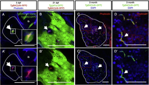 Cftr is localized to the apical membrane of the pancreatic duct epithelium throughout life. (A and A′) Transverse section of 5 dpf larvae expressing TgBAC(cftr-RFP) to show Cftr-RFP localization and TgBAC(cftr:Gal4); Tg(UAS:GFP) to mark the cytosol of cftr expressing cells with GFP. Dashed white lines indicate the periphery of pancreas. Inset is 3× magnification of ductal cells. ib: intestinal bulb. (B and B′) Transverse section of a 21 dpf larvae demonstrating Cftr-RFP localization at the apical membrane of the pancreatic duct in conjunction with TgBAC(ptf1a-GFP) expressed in the acinar cells. Cftr is observed at or near the apical membrane marked with phalloidin. (C and C2) Transverse section of 3 month, adult pancreas indicating Cftr-GFP expression in pancreatic ducts throughout the pancreas. Dashed white lines indicate the periphery of the pancreas. Red dashed box indicates inset (D). (D and D′) Cftr-GFP is localized at or near the apical membrane of the pancreatic ducts, marked by phalloidin staining. Arrows indicate ductal expression of Cftr. Scale bars=50 µm. |
