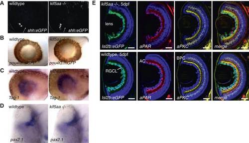 Patterning of the mutant retina and neurogenesis is not affected in mutants. (A) The expression of the Tg(shh:eGFP) transgene marks the onset of neurogenesis (white arrow) in the developing retina (Shkumatava et al., 2004) and its expression is not altered in kif5aa mutant retinae. (B) RGC differentiation marked by Tg(pou4f3:mGFP) (Xiao et al., 2005) expression is not affected. (C) The glycosylphosphatidyl inositol (GPI)-anchored protein of the immunoglobulin (Ig) superfamily Tag-1 I is expressed in nasal RGCs (Lang et al., 2001). In situ staining shows that nasal patterning is identical in wild-type and kif5aa mutant retinae. (D) Pax2.1, whose expression is restricted to the optic stalk and retinal cells around the choroid fissure and that mediates optic stalk and chiasm formation in fish (Krauss et al., 1991; Puschel et al., 1992) shows a normal expression pattern in kif5aa mutants. (E) Cryosection of Tg(Isl2:Gal4, UAS:eGFP) transgenic wild-type and mutant retinae and immunostaining against eGFP (RGCs) (Ben Fredj et al., 2010), Parvalbumin (marking amacrine cells) (Godinho et al., 2005) and protein kinase C (marking bipolar cells) (Godinho et al., 2005) shows that all cell types are present in the right retinal layer. Blue = DAPI. Scale bar = 10 µm. RGCL = RGC layer, AC = amacrine cells, BPC = bipolar cells. |