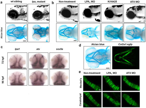 Loss of ATX-LPA1 signaling resulted in dyschondroplasia in zebrafish. (a,b) Loss of ATX- LPA1 signaling leads to deformation of the cephalic region in zebrafish embryos. Cephalic regions of wt and lpa1 mutant zebrafish embryos (a) and cephalic regions of zebrafish embryos treated with LPA1 antagonist, LPA1 or ATX morpholinos (b) at 96 hpf (side view). Cartilage tissues visualized by alcian blue and alizarin red staining are also shown (ventral view). Scale bar: 100 µm. (c) Both lpa1 and atx are co-expressed with sox9, a marker of chondrocytes, in zebrafish embryo both at 72 and 96 hpf as judged by in situ hybridization. Scale bar: 50 µm. (d,e) Loss of ATX-LPA1 signaling in zebrafish embryos leads to mislocalization of chondrocytes in cartilage tissues. (d) EGFP is expressed specifically in chondrocytes in col2:egfp transgenic zebrafish at 120 hpf. Scale bar: 100 µm. (e) In zebrafish embryos treated with LPA1 or ATX morpholinos, chondrocytes are unevenly distributed in Meckel’s and ceratohyal cartilages at 120 hpf. Scale bar: 100 µm. |