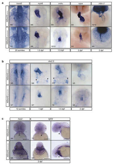 Myocardial development is affected in MZezh2 embryos. (a) In situ hybridization for different heart markers in MZezh2hu5670/+ and MZezh2hu5670/hu5670 at various time points of development. hand2 is an early myocardial marker. myh6 is a marker for atrial cells. vmhc is a marker for ventricular cells. nppa is a late myocardial marker. nfat-c1 is an endocardial marker. All these markers are expressed in MZezh2hu5670/hu5670, although vmhc, nppa, and nfat-c1 expression show a smaller number of positive cells. (b) In situ hybridization for nkx2.5 at different time points after fertilization in MZezh2hu5670/+ and MZezh2hu5670/hu5670 embryos. Arrow heads point to cells of the pharyngeal arch artery progenitors. This is absent in MZezh2hu5670/hu5670. (c) In situ hybridization for has2 and fgf24 at 2 dpf in MZezh2hu5670/hu5670 and their heterozygous siblings. In MZezh2hu5670/+ expression is restricted to the heart (arrow heads), whereas in the MZezh2hu5670/hu5670 embryos expression is visible in the area surrounding the heart tube (encircled by dashed line). For fgf24 this is also shown from a lateral view (arrow heads). Scale bar is 200 µm. The numbers indicate the number of embryos with the displayed phenotype compared to the total number of embryos analyzed. |