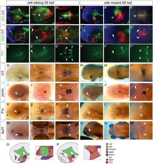 Rx3 is required for shh+ AR and anterior/tuberal differentiation. (A-N) Side or ventral views of 55hpf chk sibling or mutant embryos. Asterisks in A′,A′′ show shh+ AR, which is absent in the chk mutant (B′B′′, asterisks). White arrowheads point to otpb+ tuberal/anterior cells (C′,C′′), Group2/3 Th1+ anterior cells (E′,E′′), pomc+ cells (I,I′′), ff1b+ cells (K,K′′), all of which are absent in chk mutants (D′,D′′,F′,F′′,J,J′′,L,L′′,N,N′′), and to fezf1+ progenitors (M,M′′), which are reduced in the chk mutant (N,N′′). Green arrowheads point to expression domains unaffected in chk mutants. Purple arrowheads point to fezf1 domain, upregulated in chk mutants. White and red dotted lines as in Fig. 2. (O,P) Schematics depicting expression patterns; boxed regions show areas shown in high-power views. AH, anterior hypothalamus; oc, optic commissure; PO, preoptic hypothalamus; Tel, telencephalon; TH; tuberal hypothalamus. Scale bars: 50µm.