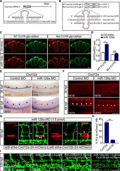 Cxcl12a is a direct functional target of miR-126a during parachordal lymphangiblast (PL) extension. A, Diagram of miR-126a target site residing in Cxcl12a mRNA 5′ untranslated region (UTR). B, Diagram of the 5′ UTR of the reporter used. C, In vivo reporter assays of the gfp mRNA bearing wild-type Cxcl12a mRNA 5′ UTR or mutated UTR coinjected with control mimic, miR-126a mimic at 24 hours post fertilization (hpf). dsred mRNA served as an internal control. D, Quantification of fluorescence density in embryos. The value of optical density was calculated by ImageJ. *P<0.05. E, Whole-mount in situ hybridization for Cxcl12a in 36 and 48 hpf embryos. The black arrowheads indicate normal expression; the red arrowheads highlight markedly reduction of Cxcl12a in miR-126aKD embryos. The penetrance of the indicated phenotype is shown in the bottom left of each picture. This assay was performed >5×. Scale bar, 200 μm. F, Immunofluorescence (IF) for Cxcl12a in 36 and 48 hpf embryos showing its dramatical decrease in 48 hpf miR-126aKD embryos. The penetrance of the indicated phenotype is shown in the bottom left of each picture. Scale bar, 100 μm. G, Confocal images of trunk vessels in 55 hpf embryos coinjected with miR-126a morpholino (MO) and Cxcl12a- or Cxcl12b-expressing plasmid revealing reformation of PL on Cxcl12a re-expression. White arrow indicates normal PL, and white arrowhead denotes the absence of PL. Scale bar, 100 μm. H, Quantification of PL reformation in embryos. n (from 4 independent biological replicates)=36 and 38 for Cxcl12a and Cxcl12b, respectively. (*P<0.05, Cxcl12a vs Cxcl12b). I, Confocal images of thoracic duct (TD) in 120 hpf embryos coinjected with miR-126a MO and Cxcl12a- or Cxcl12b-expressing plasmid revealing TD reformation on Cxcl12a re-expression. The penetrance of the indicated phenotype is shown in the bottom left of each picture. Scale bar, 100 μm. HM indicates horizontal myoseptum; and WT, wild type.