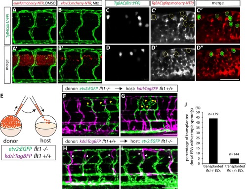 sFlt1 function in endothelial cells can limit venous ISV over-sprouting around the spinal cord. (A–B’) 82 hpf TgBAC(flt1:YFP);Tg(elavl3:gal4);Tg(UAS:mcherry-NTR) trunks after treatment with DMSO (A and A’) or 2 mM Mtz (B and B’) between 30 and 82 hpf. TgBAC(flt1:YFP) expression is observed strongly in ECs and weakly in cells residing in the spinal cord. Genetic ablation of neurons leads to an almost complete loss of TgBAC(flt1:YFP) expression in the spinal cord (B and B’). Scale bar, 50 µm. (C–C” and D–D”) High magnification single-plane confocal images of 80 hpf TgBAC(flt1:YFP);TgBAC(gfap:gal4ff);Tg(UAS:mcherry-NTR) spinal cord. TgBAC(flt1:YFP) expression does not co-localize with mCherry+ radial glia. Yellow dashed circles mark the position of the TgBAC(flt1:YFP)-positive spinal cord cells (C’, C”, D’, and D”). Scale bar, 30 µm. (E) Schematic diagram of the transplantation assay (F–J). Cells taken from TgBAC(etv2:EGFP) flt1bns29/bns29 or Tg(kdrl:TagBFP) flt1+/+ donor embryos were transplanted into Tg(kdrl:TagBFP) flt1+/+ or TgBAC(etv2:EGFP) flt1bns29/bns29 host embryos, respectively. (F and G) 154 hpf Tg(kdrl:TagBFP) flt1+/+ trunk vasculature with transplanted cells from TgBAC(etv2:EGFP) flt1bns29/bns29 embryos. Yellow arrows point to ectopic sprouts from transplanted TgBAC(etv2:EGFP) flt1bns29/bns29 ECs in the dorsal trunk. Only the transplanted TgBAC(etv2:EGFP) flt1bns29/bns29 ECs, but not the neighboring Tg(kdrl:TagBFP) flt1+/+ ECs, exhibit ectopic ISV sprouting. Scale bar, 100 µm. (H and I) 154 hpf TgBAC(etv2:EGFP) flt1bns29/bns29 trunk vasculature with transplanted cells from Tg(kdrl:TagBFP) flt1+/+ embryos. White arrows point to transplanted Tg(kdrl:TagBFP) flt1+/+ ECs in the dorsal trunk, which do not exhibit ectopic sprouting, unlike neighboring TgBAC(etv2:EGFP) flt1bns29/bns29 ECs that show ectopic sprouting. Scale bar, 100 µm. (J) Percentage of transplanted ISVs in the dorsal trunk that exhibited ectopic sprout(s) at 154 hpf for the experiments shown in panels (F–I). |