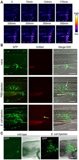 In vivo visualization of NF-κB activity upon local wounding and infection. (A) Time-lapse images derived from Movie 2 show NF-κB activation after tailfin cut. GFP fluorescence in the top panel is shown as a heat map. GFP is upregulated locally near the wound. (B,C) Injection of HcRed-expressing E. coli into the notochord (B) or inner ear (C) of Tg(8×Hs.NFκB:GFP,Luciferase) elicits NF-κB activation 20 h after infection. The bacterial infection results in the accumulation of immune cells in the inner ear. GFP was not expressed in the notochord or inner ear of uninfected control zebrafish. The white dashed line in (C) demarcates the inner ear. Anterior is to the left. Scale bars: 150 µm (A,C); 200 µm (B). |