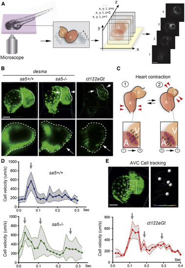 Heart Biomechanics Are Altered in the Absence of desma and in the Presence of Desmin Aggregates (A) 4D reconstructions of the heart-wall dynamics were obtained from 2D series recorded at a rate of 120 frames/s (fps) in successive planes. Periodic contractions were reconstructed in three dimensions using post acquisition synchronization of 48-hpf embryonic hearts. Scale bar, 30 μm. (B) Comparison of myocardial wall shape in desmasa5+/+, desmasa5−/−, and ct122aGt 4D reconstructed hearts shows a squeezing of the ventricle in both mutants ( Movies S2, S3, and S4). The lower panels show a zoom of an optical transverse section through the middle of the ventricle of desmasa5+/+, desmasa5−/−, and ct122aGt revealing the squeezing in absence of functional Desma (red arrows). Scale bar, 30 μm. (C) Schematic drawing recapitulating the myocardial movements associated with heart contraction and the subsequent movement of the atrioventricular canal (AVC). Examples of AVC cells tracks are shown in the lower panel. Their velocity was used as readout of the global contraction pattern of the heart. Scale bar, 30 μm. (D) Graph representing the velocity of myocardial cell motion in the AVC region following 3D cell tracking in desmasa5+/+, desmasa5−/−, and ct122aGt. (E) Individual nuclei were tracked automatically and their speed was extracted. ct122aGt indicates desmact122aGt homozygous embryos. The error bars correspond to the SEM. |