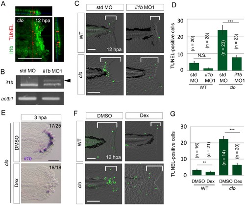 il1b knockdown or Dex treatment rescued the clo from apoptosis. (A) Simultaneous detection of apoptosis by TdT-mediated dUTP nick end labeling (TUNEL) and the il1b-expressing cell at 12 hpa in the clo mutant carrying the transgene il1b:egfp. Most of the TUNEL-positive cells were detected in close association with the il1b-expressing epithelial cells. Vertical and horizontal lines indicate the approximate sites of the optical sections. Scale bar, 100 μm. (B) RT-PCR analysis of il1b and actinb1 expression in zebrafish larvae injected with il1b MO. The il1b MO was targeted to the splice donor site. Arrowhead indicates the aberrant transcript. (C) TUNEL analysis in amputated WT or clo larvae (12 hpa) after il1b knockdown. Injection of il1b MO substantially reduced the apoptosis of regenerative cells in the clo mutant, whereas the apoptosis was unaffected by std MO. Scale bars, 50 μm. (D) Quantification of TUNEL staining in the areas bracketed in (C). (E) ISH analysis of il1b expression at 3 hpa in larvae treated with Dex. DMSO: dimethyl sulfoxide, used as the vehicle. Dex treatment abolished il1b expression. Scale bar, 50 μm. (F) TUNEL staining in the amputated fin fold at 12 hpa in Dex-treated WT and clo larvae. Scale bars, 50 μm. (G) Quantification of TUNEL staining in the areas bracketed in (F). In (D) and (G), data are presented as means ± SEM. Student’s t test, **p<0.01; ***p<0.001; N.S., not significant (p=0.172). |