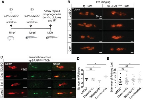 Combined treatment with BRAF and MEK inhibitors suppresses morphologic effects induced by BRAFV600E in thyrocytes and restores normal follicle structure. (A) Schematic diagram of experimental scheme and treatment conditions of tg-TOM and tg-BRAFV600E-TOM larvae. (B) Epifluorescent live images of tg-TOM and tg-BRAFV600E-TOM larvae treated with either DMSO (vehicle), 2.5 μM dabrafenib, 10 μM selumetinib, or the combination of 2.5 μM dabrafenib and 10 μM selumetinib. (C) Representative confocal images of tg-BRAFV600E-TOM larvae treated with either DMSO (vehicle), 2.5 μM dabrafenib, 10 μM selumetinib, or the combination of 2.5 μM dabrafenib and 10 μM selumetinib and subject to immunofluorescence (IF) using anti-T4 antibody. (D–E) Quantification of thyroid follicle number (D) and follicle diameter (E) in tg-BRAFV600E-TOM larvae after drug treatment compared to vehicle (DMSO) control. The experiment was performed in triplicate. *p≤0.05, **p≤0.01, Student's two-tailed t-test, ns: not significant. |
