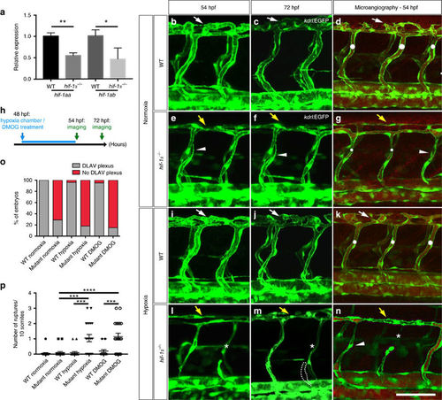 hif-1α mutants fail to form the DLAV plexus and exhibit hypoxia-induced vascular disconnections. (a) qPCR analysis of hif-1aa and hif-1ab transcripts in WT siblings and hif-1α mutants at 48 hpf. Values represent mean±s.d., n = 3 biological replicates, (*P<0.05; **P<0.01; t-test). (b–g) Maximal intensity projections of confocal z-stacks of Tg(kdrl:EGFP) WT siblings and hif-1α−/− embryos in normoxia at 54 and 72 hpf, as well as after microangiography at 54 hpf. (h) Schematic representation of the experiment shown in i–p. (i–n) Maximal intensity projections of confocal z-stacks of Tg(kdrl:EGFP) WT siblings and hif-1α−/− embryos after hypoxia chamber treatment for 6 h at 54 and 72 hpf, along with microangiography at 54 hpf. All images represent lateral views. White dots indicate approximate lumen size, white arrows point to DLAV plexus in WT, yellow arrows indicate absence of DLAV plexus in hif-1α−/−, arrowheads point to non-perfused ISVs, asterisks indicate vessel ruptures and dotted lines outline regressed blood vessel. (o) Quantification of embryos showing normal (grey) or abnormal/absent (red) DLAV plexus formation in 54 hpf WT siblings and hif-1α−/− in normoxia, and after hypoxia chamber or DMOG treatment for 6 h starting at 48 hpf. (p) Quantification of blood vessel ruptures in a 10 somite-long trunk area in 54 hpf WT siblings and hif-1α−/−in normoxia, and after hypoxia chamber or DMOG treatment for 6 h starting at 48 hpf. Bars represent mean±s.e.m., n=20 embryos from three different clutches, (***P<0.001; ****P<0.0001; t-test). Scale bar, 50 μm. |