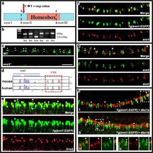 V0v cells co-express evx1 and evx2. a Schematic of Evx2 showing exon boundaries (dotted lines), homeobox-domain (pink) and location of evx2 sa140 mutation (red arrow). b Examples of genotyping WT, heterozygous and homozygous evx2 sa140 mutant embryos using gel electrophoresis (see methods). The two fragments from the mutant allele restriction product run at the same position on the gel. c, e-h lateral views, dorsal up, anterior left, of spinal cord at 24 h (f-h) or 27 h (c & e). c Evx2 immunohistochemistry on WT (top panel) and homozygous evx2 sa140 mutant (bottom panel) embryos. Stars indicate Evx2-expressing cells. Mutant embryos have no Evx2 expression. d Schematic showing Shuffle-LAGAN analysis of evx1 genomic region with zebrafish sequence as baseline compared to orthologous regions in mouse and human genomes. Conserved coding sequences are indicated in blue, arrow indicates 5'-3' orientation. CNEs in 3’ region are indicated in pink. The region amplified to create transgenic lines is indicated with red dotted lines. e-h Double staining for (e) EGFP (green) and Evx2 (red) in Tg(evx1:EGFP) SU1 embryos, (f) EGFP (green) and evx1 (red) in Tg(evx1:EGFP) SU1 embryos, (g) evx1 (red) and evx2 (green) in WT embryos, (h) EGFP (green) and dbx1a (red) in Tg(evx1:EGFP) SU1 embryos (i and iii) and EGFP (green) and dbx1b (red) in Tg(evx1:EGFP) SU1 embryos (ii and iv). In e-g and h_iii - h_iv, merged and single channel views are provided. White crosses indicate cells that only express evx1. In (f) these probably represent cells that have just started to express evx1 as there is a delay in expression of EGFP. White stars in h indicate double-labelled cells. Three wider panels at bottom of h (iii and iv) are magnified single-confocal-plane views of white dotted rectangle regions in panels h_i and h_ii respectively. Thin panel on RHS in each case shows a cross-section projection (slice) created in Image J confirming that GFP expression is lateral to dbx expression. Scale bar: 50 μm (c & e-h)