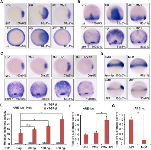 Net1 upregulates Nodal signal transduction. (A,B) Knockdown of net1 decreases Nodal ligand-induced mesendoderm expansion. Wild-type embryos were injected with 1 pg sqt mRNA alone or concurrently with 4 ng net1 MO1 at the one-cell stage, harvested at the shield and 75% epiboly stages, and analyzed for the expression of indicated marker genes by using whole-mount in situ hybridization. (C) Zebrafish embryos were injected with net1 2Mix (300 pg Flag-net1 mRNA and 1 ng AS-Flag-photo-MO) at the one-cell stage. A subset of these embryos was treated with 25 μM SB431542 (SB) from the 64-cell stage, of which a portion was exposed to UV light at the sphere stage. The expression of gsc and sox17 was examined by in situ hybridization at the shield and 75% epiboly stages, respectively. (D) The expression of Nodal target genes cyc and fscn1a in cMO- and net1 MO1-injected embryos at shield stage. Lateral view with animal pole to the top. In A–D, the percentages (mean±s.d.) of the affected embryos are shown as calculated from three independent biological repeats with ∼15–25 embryos in each group. UIC, uninjected control. (E,F) Overexpression of Net1 enhanced ARE-luciferase expression. (E) HeLa cells were transfected with the ARE-luciferase reporter concurrently with increasing amounts of Net1. At 36 h post transfection, the cells were treated with TGF-β1 or left untreated overnight, and then harvested for luciferase assays. *P<0.05; NS, not significant (Student's t-test). (F) At the one-cell stage, zebrafish embryos were injected with the ARE-luciferase reporter alone or together with net1 2Mix. At the sphere stage, half of the net1 2Mix-injected embryos were exposed to UV light, and then all embryos were harvested at the shield stage for luciferase assays. *P<0.05 (Student's t-test). (G) Knockdown of net1 inhibits ARE-luciferase expression. At the one-cell stage, zebrafish embryos were co-injected with the ARE-luciferase reporter and cMO or net1 MO1, and then harvested at the shield stage for luciferase assays. **P<0.01 (Student's t-test). Results in E–G are mean±s.d. (n=3).